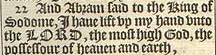 22 And Abram said to the King of Sodome, I haue lift vp my hand vnto the LORD, the most high God, the possessour of heauen and earth,