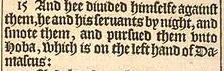 15 And hee diuided himselfe against them, he and his seruants by night, and smote them, and pursued them vnto Hoba, which is on the left hand of Damascus: