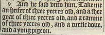 9 And he said vnto him, Take me an heifer of three yeeres old, and a shee goat of three yeeres old, and a ramme of three yeeres old, and a turtle doue, and a yong pigeon.