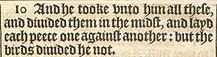 10 And he tooke vnto him all these, and diuided them in the midst, and layd each peece one against another: but the birds diuided he not.