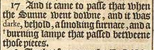 17 And it came to passe that when the Sunne went downe, and it was darke, behold, a smoking furnace, and a + burning lampe that passed betweene those pieces. [+ Hebrewe. a lampe of fire. ]