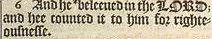 6 And he *beleeued in the LORD; and hee counted it to him for righteousnesse. [ * Rom.4.3. galat.3.6. iam.2.23. ]