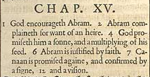 1 Gott ermutigt Abram.2 Abram murrt wegen des Mangels an einem Erben. 4 Gott verspricht ihm einen Sohn und eine Vervielfältigung seiner Nachkommen. 6 Abram ist gerechtfertigt durch den Glauben. 7 Kanaan wird wieder verheißen, bestätigt durch ein Zeichen, 12 und eine Vision.