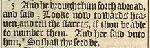 5 And he brought him forth abroad, and said, Looke now towards heauen, and tell the starres, if thou be able to number them. And hee said vnto him, *So shall thy seed be. [ * Rom.4. 18 ]