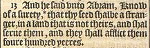 13 And he said vnto Abram, Know of a surety, * that thy seed shalbe a stranger, in a land that is not theirs, and shal serue them, and they shall afflict them foure hundred yeeres. [ * Acts 7.6.]