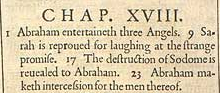 1 Abraham bewirtet drei Engel. 9 Sarah wird für ihr Lachen über das außergewöhnliche Versprechen gemaßregelt. 17 Die Zerstörung von Sodom wird Abraham offenbart. 23 Abraham macht Fürbitte für die Menschen daraus.