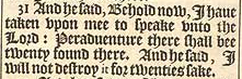 31 And he said, Behold now, I haue taken vpon mee to speake vnto the Lord: Peraduenture there shall bee twenty found there. And he said, I will not destroy it for twenties sake.