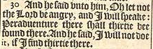 30 And he said vnto him, Oh let not the Lord be angry, and I will speake: Peraduenture there shall thirtie bee found there. And he said, I will not doe it, if I find thirtie there.