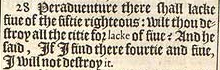 28 Peraduenture there shall lacke fiue of the fiftie righteous: wilt thou destroy all the citie for lacke of fiue? And he said, If I find there fourtie and fiue, I will not destroy it.