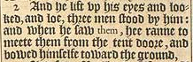 2 And he lift vp his eyes and looked, and loe, three men stood by him: and when he saw them, hee ranne to meete them from the tent doore, and bowed himselfe toward the ground,