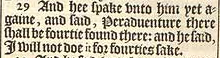 29 And hee spake vnto him yet againe, and said, Peraduenture there shall be fourtie found there: and he said, I will not doe it for fourties sake.