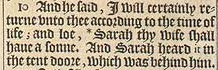 10 And he said, I will certainly returne vnto thee according to the time of life; and loe, *Sarah thy wife shall haue a sonne. And Sarah heard it in the tent doore, which was behind him. [ *Chap. 17. 19. and 21. 2 ]