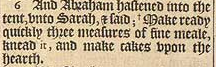 6 And Abraham hastened into the tent, vnto Sarah, & said; + Make ready quickly three measures of fine meale, knead it, and make cakes vpon the hearth. [ +Hebr. Hasten.]