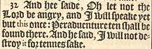 32 And hee saide, Oh let not the Lord be angry, and I will speake yet but this once: Peraduenture ten shall be found there. And he said, I will not destroy it for tennes sake.