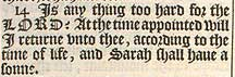 14 Is any thing too hard for the LORD? At the time appointed will I returne vnto thee, according to the time of life, and Sarah shall haue a sonne.