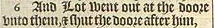 6 And Lot went out at the doore vnto them, & shut the doore after him,