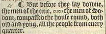 4 ¶ But before they lay downe, the men of the citie, euen the men of Sodom, compassed the house round, both old and yong, all the people from euery quarter.