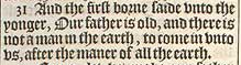 31 And the first borne saide vnto the yonger, Our father is old, and there is not a man in the earth, to come in vnto vs, after the maner of all the earth.