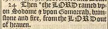 24 Then * the LORD rained vpon Sodome & vpon Gomorrah, brimstone and fire, from the LORD out of heauen. [ *Deut. 29. 23. luk. 17. 29. isa.13. 19. ier.50. 40. amos 4. 11. iude 7. ]
