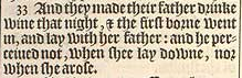 33 And they made their father drinke wine that night, & the first borne went in, and lay with her father: and he perceiued not, when shee lay downe, nor when she arose.