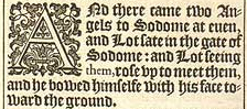 1 And there came two Angels to Sodome at euen, and Lot sate in the gate of Sodome: and Lot seeing them, rose vp to meet them, and he bowed himselfe with his face toward the ground.