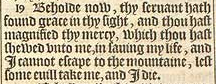 19 Beholde now, thy seruant hath found grace in thy sight, and thou hast magnified thy mercy, which thou hast shewed vnto me, in sauing my life, and I cannot escape to the mountaine, lest some euill take me, and I die.
