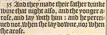 35 And they made their father drinke wine that night also, and the yonger arose, and lay with him: and he perceiued not, when she lay downe, nor when she arose.