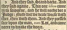 9 And they said, Stand backe. And they said againe, This one fellow came in to soiourne, and he will needs bee a Iudge: Now wil we deale worse with thee, then with them. And they pressed sore vpon the man, euen Lot, and came neere to breake the doore.