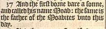 37 And the first borne bare a sonne, and called his name Moab: the same is the father of the Moabites vnto this day.