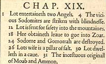 1 Lot bewirtet zwei Engel. 4 Die bösartigen Sodomiten werden mit Blindheit geschlagen. 12 Lot wird zur Sicherheit in die Berge geschickt. 18 Er erhält Erlaubnis nach Zoar zu gehen. 24 Sodom und Gomorrah werden zerstört. 26 Lots Frau ist eine Salzsäule. 30 Lot wohnt in einer Höhle. 31 Die inzestöse Herkunft von Moab und Ammon.