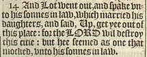 14 And Lot went out, and spake vnto his sonnes in law, which married his daughters, and said, Up, get yee out of this place: for the LORD wil destroy this citie: but hee seemed as one that mocked, vnto his sonnes in law.