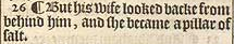 26 ¶ But his wife looked backe from behind him, and she became a pillar of salt.