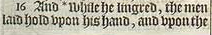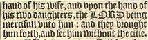 Weish. 16 And *while he lingred, the men laid hold vpon his hand, and vpon the hand of his wife, and vpon the hand of his two daughters, the LORD being mercifull vnto him: and they brought him forth, and set him without the citie. [ * Wisd. 10. 6. ]