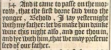 34 And it came to passe on the morrow, that the first borne said vnto the yonger, Behold, I lay yesternight with my father: let vs make him drinke wine this night also, and goe thou in, and lye with him, that we may preserue seed of our father.