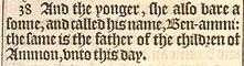 38 And the yonger, she also bare a sonne, and called his name, Ben-ammi: the same is the father of the children of Ammon, vnto this day.