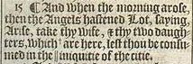 15 ¶ Und als der Morgen anbrach, drängten die Engel Lot und sagten “Steh auf, nimm deine Frau und deine beiden Töchter, die hier +sind, sonst wirst du mit ||dem Unrecht der Stadt verzehrt.[+Hebr.: zu finden sind ||oder: der Bestrafung]