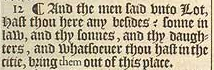 12 ¶ And the men said vnto Lot, Hast thou here any besides? sonne in law, and thy sonnes, and thy daughters, and whatsoeuer thou hast in the citie, bring them out of this place.