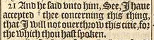 21 And he said vnto him, See, I haue accepted +thee concerning this thing, that I will not ouerthrow this citie, for the which thou hast spoken. [+ Wisd. 10. 6.]