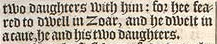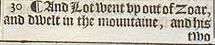 30 ¶ And Lot went vp out of Zoar, and dwelt in the mountaine, and his two daughters with him: for hee feared to dwell in Zoar, and he dwelt in a caue, he and his two daughters.