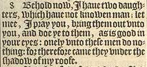 8 Behold now, I haue two daughters, which haue not knowen man; let mee, I pray you, bring them out vnto you, and doe ye to them, as is good in your eyes: onely vnto these men do nothing: for therefore came they vnder the shadow of my roofe.