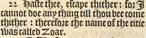 22 Haste thee, escape thither: for I cannot doe any thing till thou bee come thither: therefore the name of the citie was called Zoar.