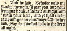 2 And he said, Beholde now my Lords, turne in, I pray you, into your seruants house, and tarie all night, and *wash your feete, and ye shall rise vp early and goe on your wayes. And they said, Nay: but we wil abide in the street all night. [ *Chap. 18. 4. ]