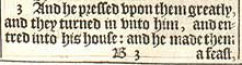 3 And he pressed vpon them greatly, and they turned in vnto him, and entred into his house: and he made them a feast, and did bake vnleauened bread, and they did eate.