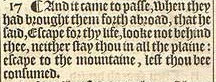 17 ¶ Und es geschah, als sie sie weit nach draußen fortgebracht hatten, dass er sagte “Flieht um euer Leben, seht nicht hinter euch, noch bleibt in der Ebene: Flieht in die Berge, sonst werdet ihr verzehrt.