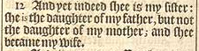 12 And yet indeed shee is my sister: she is the daughter of my father, but not the daughter of my mother; and shee became my wife.