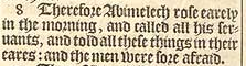 8 Therefore Abimelech rose earely in the morning, and called all his seruants, and told all these things in their eares: and the men were sore afraid.