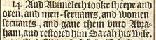 14 And Abimelech tooke sheepe and oxen, and men-seruants, and women seruants, and gaue them vnto Abraham, and restored him Sarah his wife.
