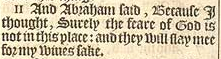 11 And Abraham said, Because I thought, Surely the feare of God is not in this place: and they will slay mee for my wiues sake.