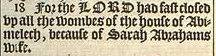 18 For the LORD had fast closed vp all the wombes of the house of Abimelech, because of Sarah Abrahams wife.