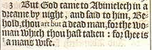 3 But God came to Abimelech in a dreame by night, and said to him, Behold, thou art but a dead man, for the woman which thou hast taken: for shee is + a mans wife. [+ Heb. married to an husband. ]